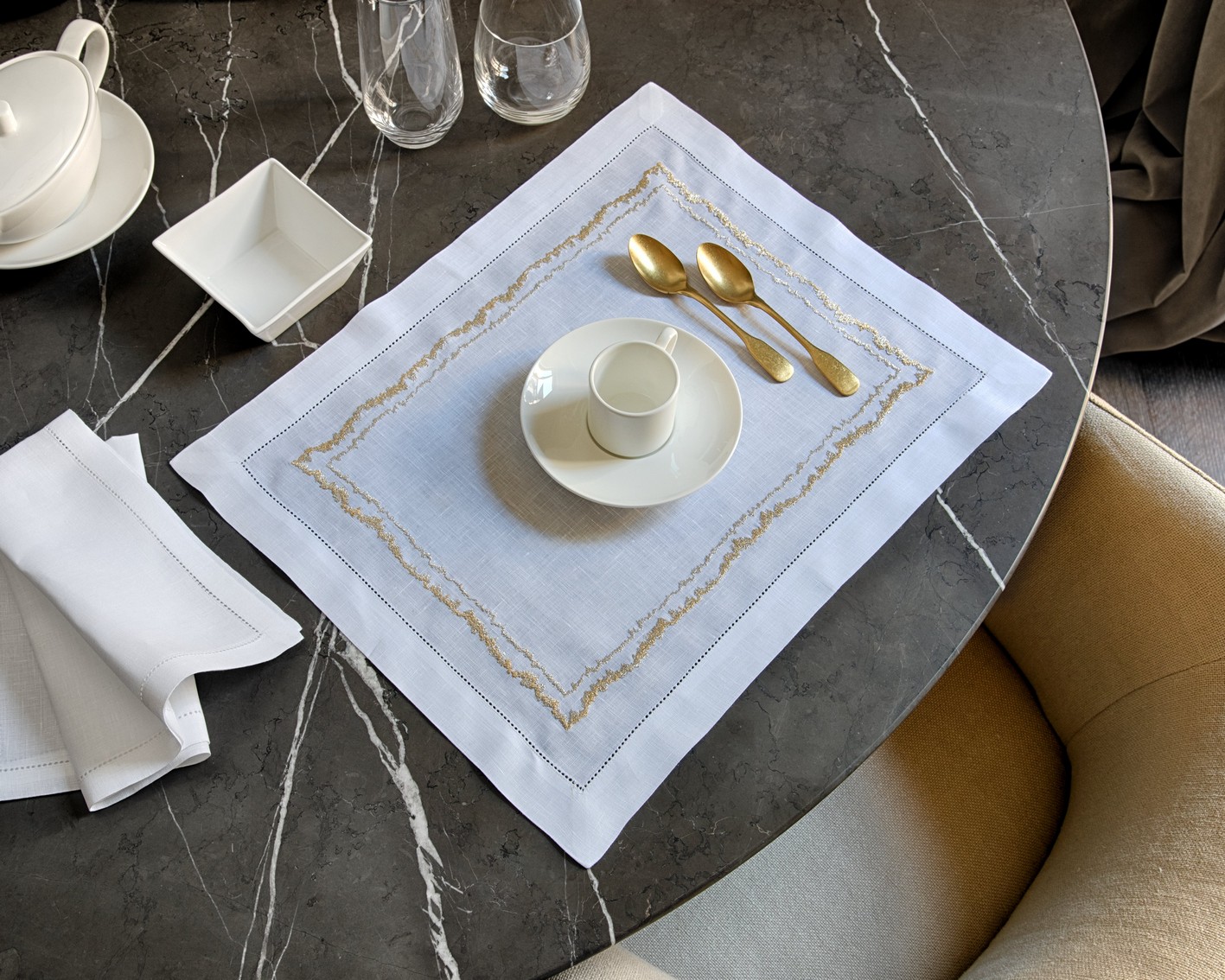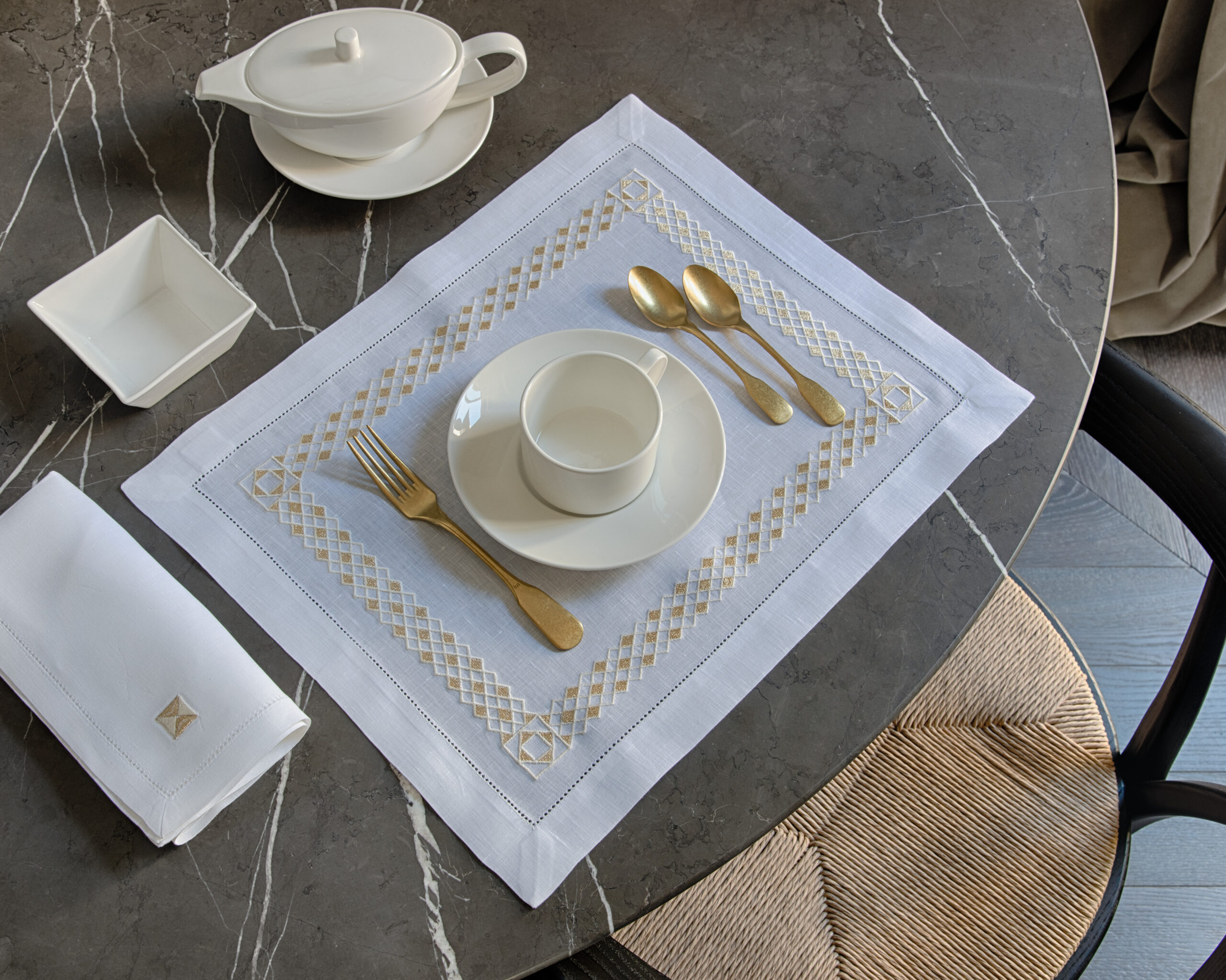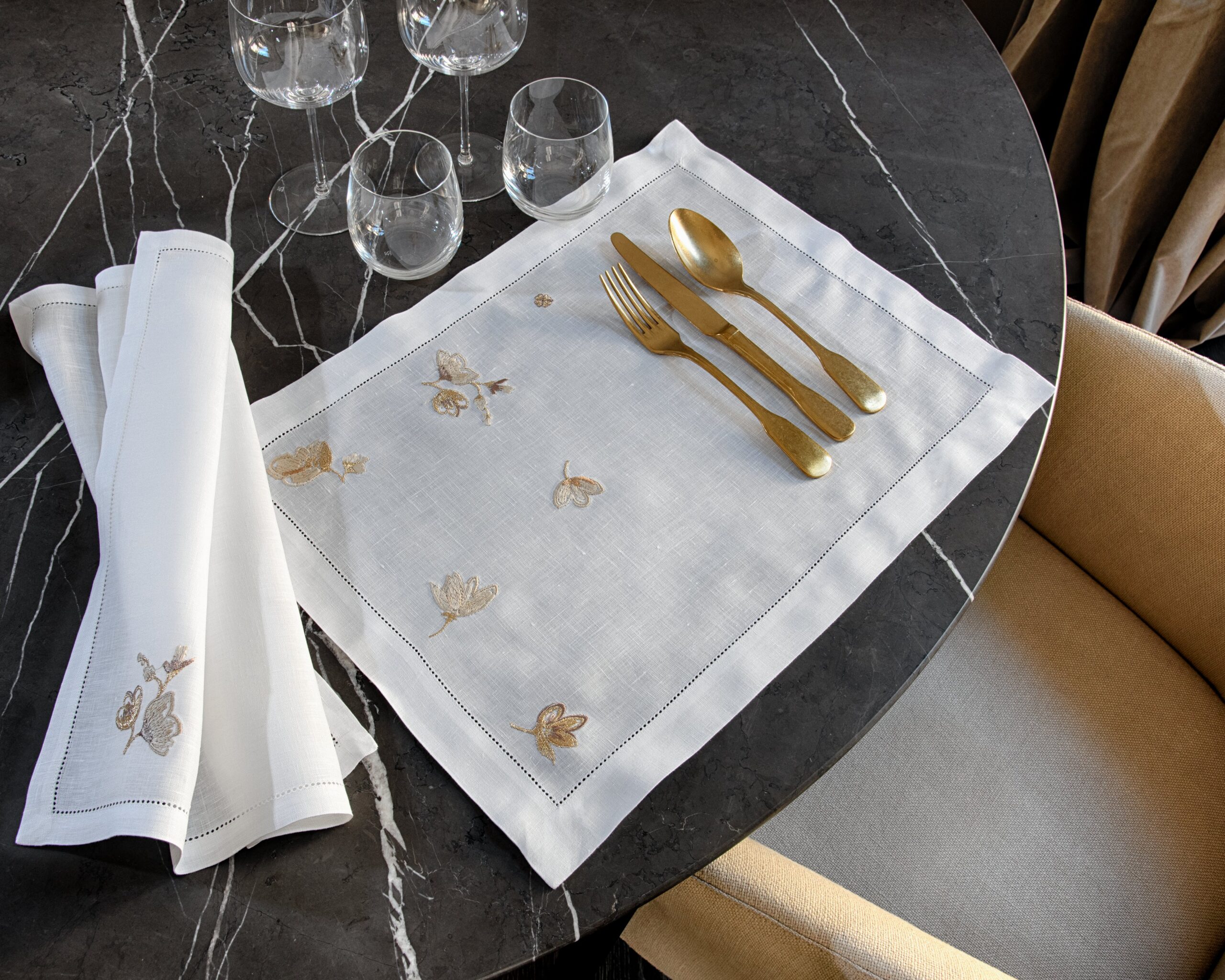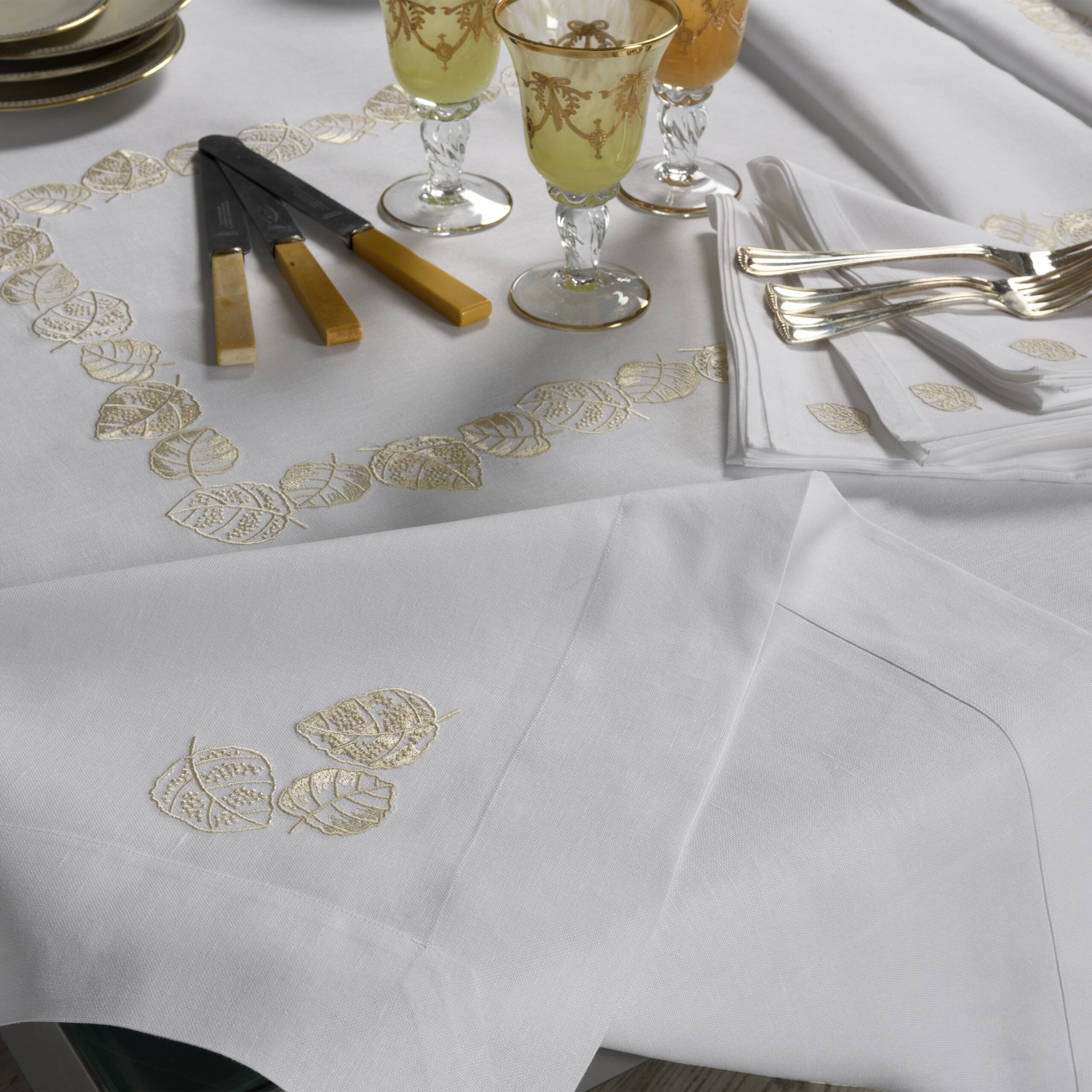 Hand-crafted excellence defines every piece of table linen. Skilled craftsmanship ensures that each napkin, placemat, runner, and tablecloth is produced to the highest standard. Details such as mitred corners and hand-finished lace inserts reflect European know-how, elevating functionality into timeless artistry.